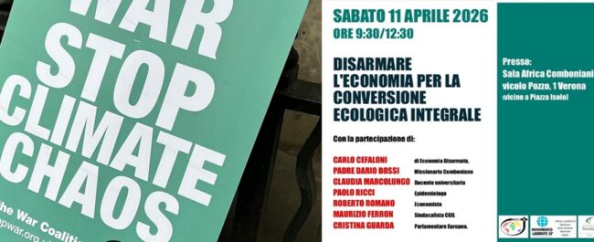 “Disarmare l’economia per la conversione ecologica integrale” è stato il tema al centro di un lungo e partecipato dibattito ospitato a Verona, sulla scia dell’Arena di Pace, nella casa dei Missionari Comboniani presso la Fondazione Nigrizia. Oltre ottanta partecipanti, provenienti da diverse organizzazioni della società civile del Veneto, si sono confrontati su uno scenario globale… Read More