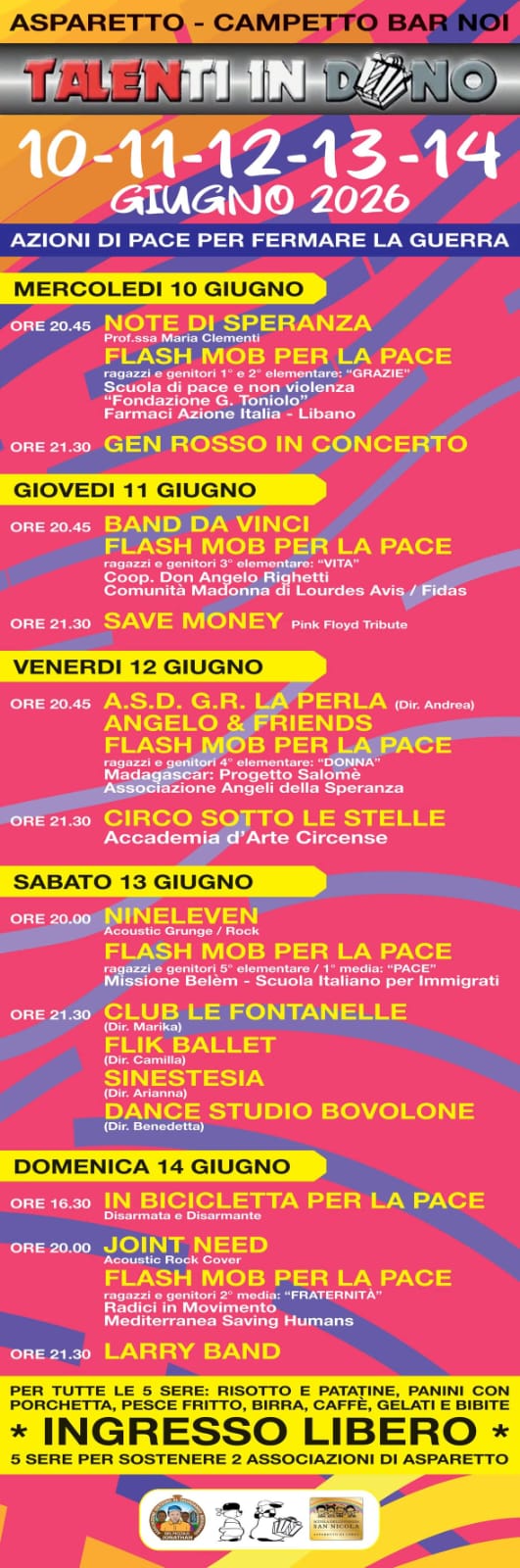 ASPARETTO DI CEREA (VR) – TALENTI IN DONO Continua quest’anno la rassegna TALENTI IN DONO con un tema attualissimo: AZIONI DI PACE PER FERMARE LA GUERRA Visualizzazioni: 7