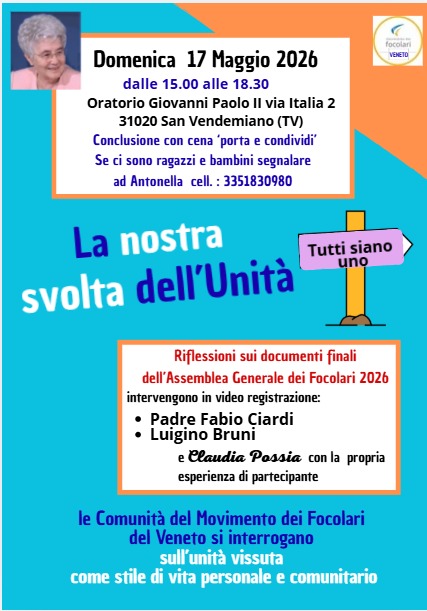 BELLUNO E TREVISO: LA NOSTRA SVOLTA DELL’UNITA’ “Le comunità di Belluno, Conegliano-Vittorio Veneto, Castelfranco e Treviso si ritrovano confrontandosi sull’unità vissuta come stile di vita personale e comunitario.” Visualizzazioni: 11
