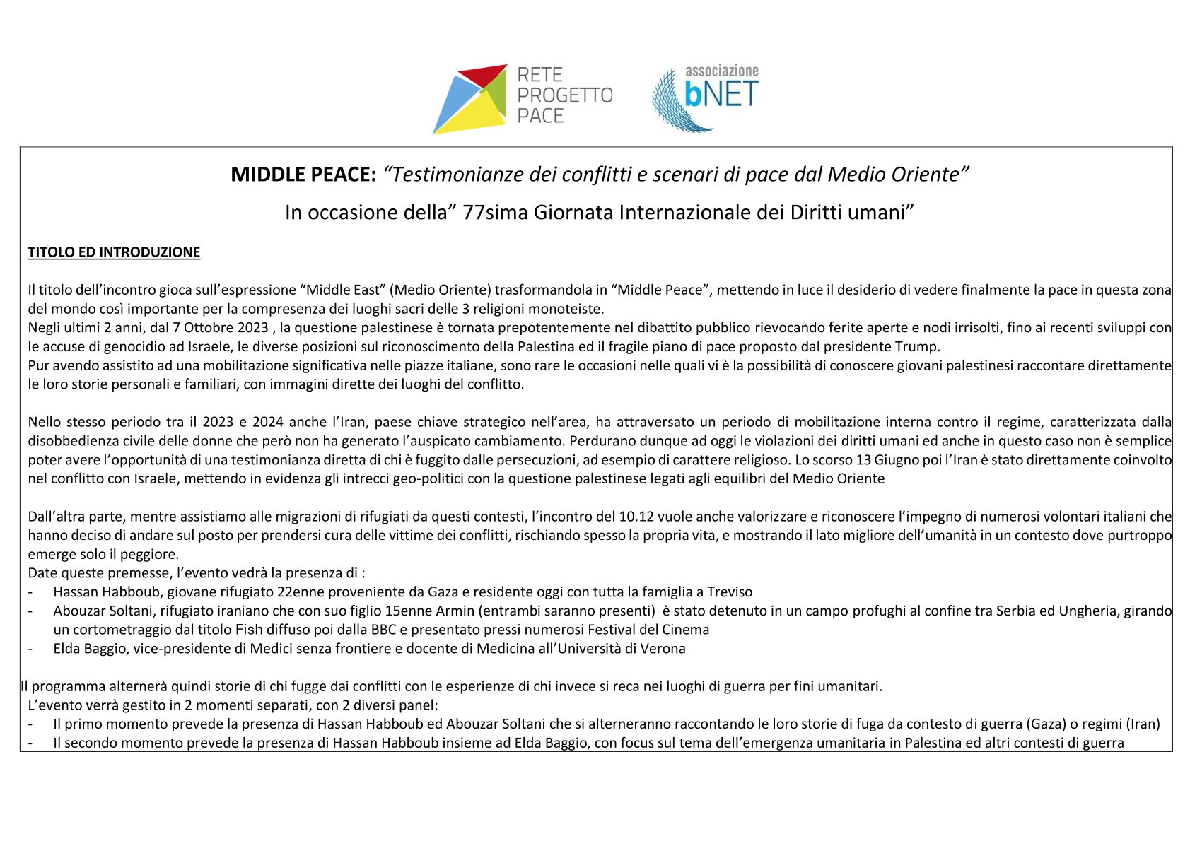 In occasione della 77sima Giornata Internazionale dei Diritti Umani, Rete Progetto Pace e associazione BNET propongono il convegno MIDDLE PEACE.