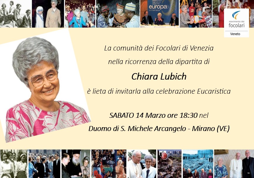 Le comunità dei Focolari del Veneziano, quest’anno nella ricorrenza della dipartita di Chiara Lubich, sono liete di invitare tutta la cittadinanza, Sabato 14 Marzo alle ore 18:30, alla celebrazione Eucaristica che si terrà nel Duomo di S. Michele Arcangelo di Mirano (VE).