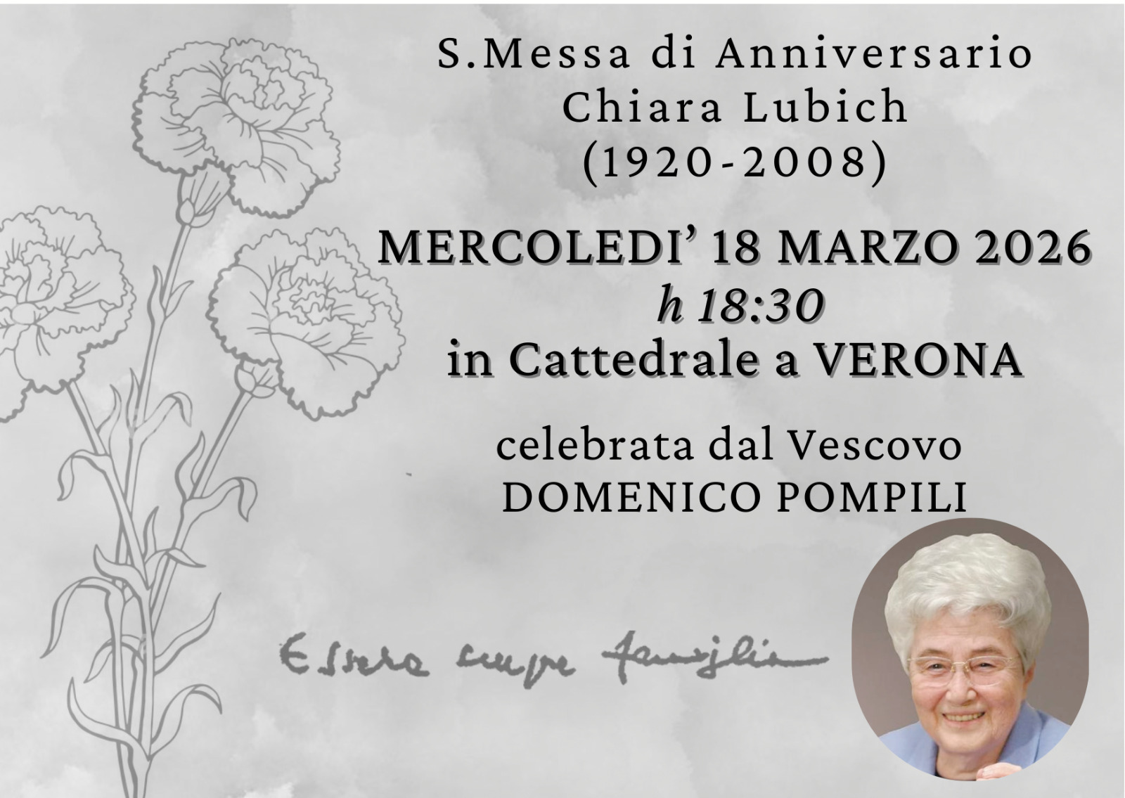 VERONA – Anniversario di Chiara Anche quest’anno avremo la gioia di celebrare l’anniversario di Chiara col nostro vescovo. Visualizzazioni: 150