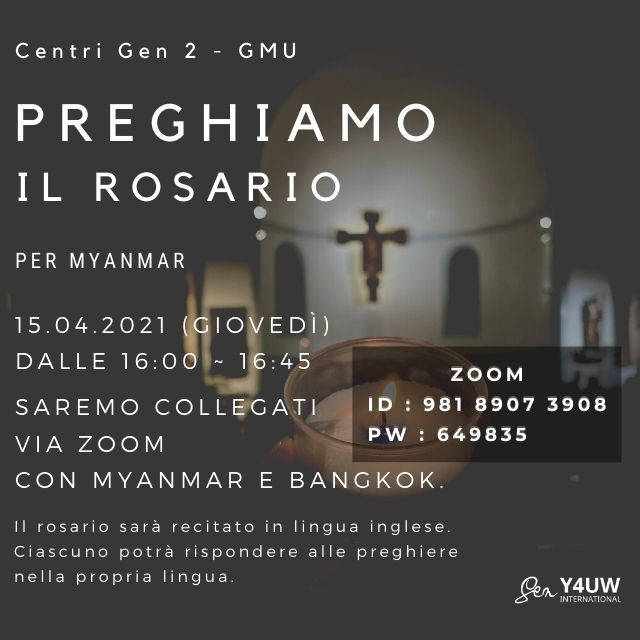 Il rosario è tenuto dal focolare di Rangoon in Myanmar, ma sono collegati anche  tanti altri focolari e persone del sud est dell’Asia (Bangkok, Indonesia, Vietnam, Malesia, Singapore, Filippine, Timor Est, India). Anche in  tanti dall’Italia, dall’Europa, dall’America, dal mondo insomma, fanno altrettanto. Varie persone delle nostre comunità di Venezia, considerando i vari fusi orari – per qualcuno è notte, per altri mattino presto, o pomeriggio per noi – hanno deciso di aderire.