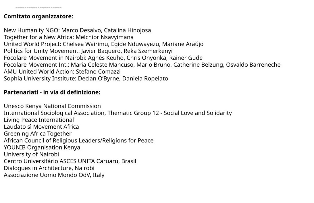 in collaborazione con Unesco Kenya National Commission, International Sociological Association (Social Love and Solidarity), Laudato sì Movement Africa, Greening Africa Together, African Council of Religious Leaders/Religions for Peace, YOUNIB Organisation Kenya