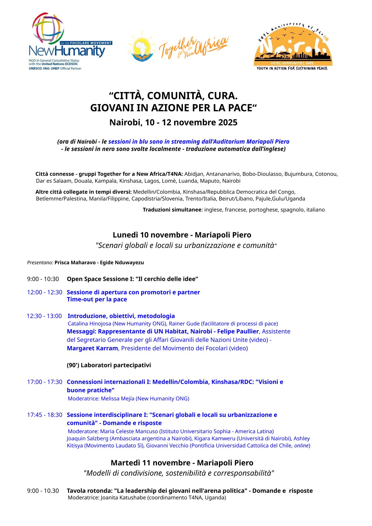 Siamo al via! Nella crisi del quadro internazionale, mentre i processi di urbanizzazione pongono pressanti interrogativi, il convegno intende proporre forme sociali e di governance più ricche di umanità, mettendo in discussione il ritorno di modelli individualistici. La collocazione a Nairobi ha permesso di dare particolare rilievo alle culture del continente africano, in dialogo con alcune città nel pianeta, da cui prenderanno la parola gruppi della società civile e delle istituzioni. Attenzione specifica verrà data al ruolo attuale delle Nazioni Unite nel loro 80° anniversario. In programma anche un messaggio video di Felipe Paullier, Vicesegretario Generale ONU per la Gioventù, oltre che di Margaret Karram, presidente del Movimento dei Focolari.